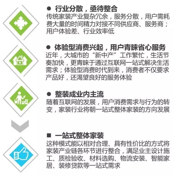 家裝行業(yè)各方面逐步走向多方整合、協(xié)同發(fā)展。產(chǎn)品方面,線上的產(chǎn)品功能與線下服務保持統(tǒng)一;供應鏈方面,集中采購和供應鏈的重新組合,使產(chǎn)品品牌越來越聚焦;設計方面,逐步一體化,增強了產(chǎn)品的整體銷售力;服務方面,高效保質的服務鏈保障了用戶的體驗。