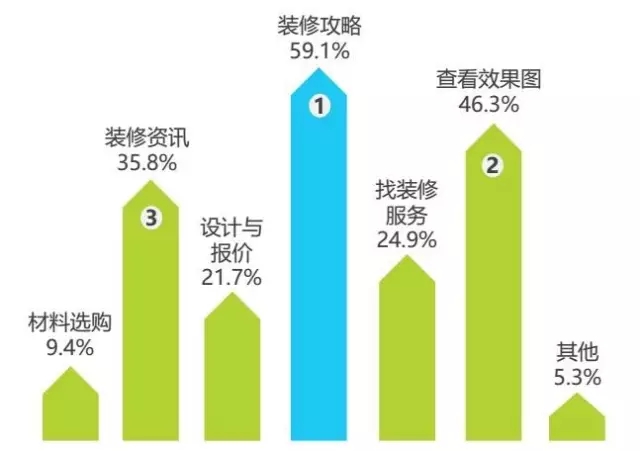 互聯(lián)網(wǎng)家裝用戶在線上使用的服務主要集中在查看裝修攻略、效果圖和獲取裝修咨詢這類參考信息型服務,也逐漸涉及找裝修服務、涉及與報價、材料選購這樣的交易型服務。線上交易與線下裝修結合構成互聯(lián)網(wǎng)家裝閉環(huán)。