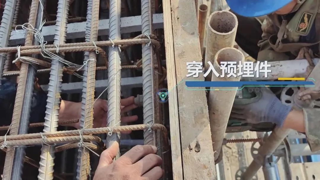 在梁側(cè)模板處打孔,孔位要對準連接螺桿位置,將預(yù)埋件穿入,用扎絲固定在梁鋼筋上,螺桿安裝完成后,由專門檢測機構(gòu)對螺桿進行拉力抽測。